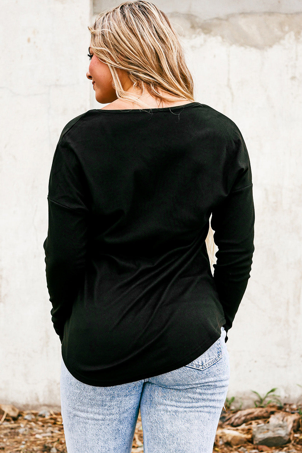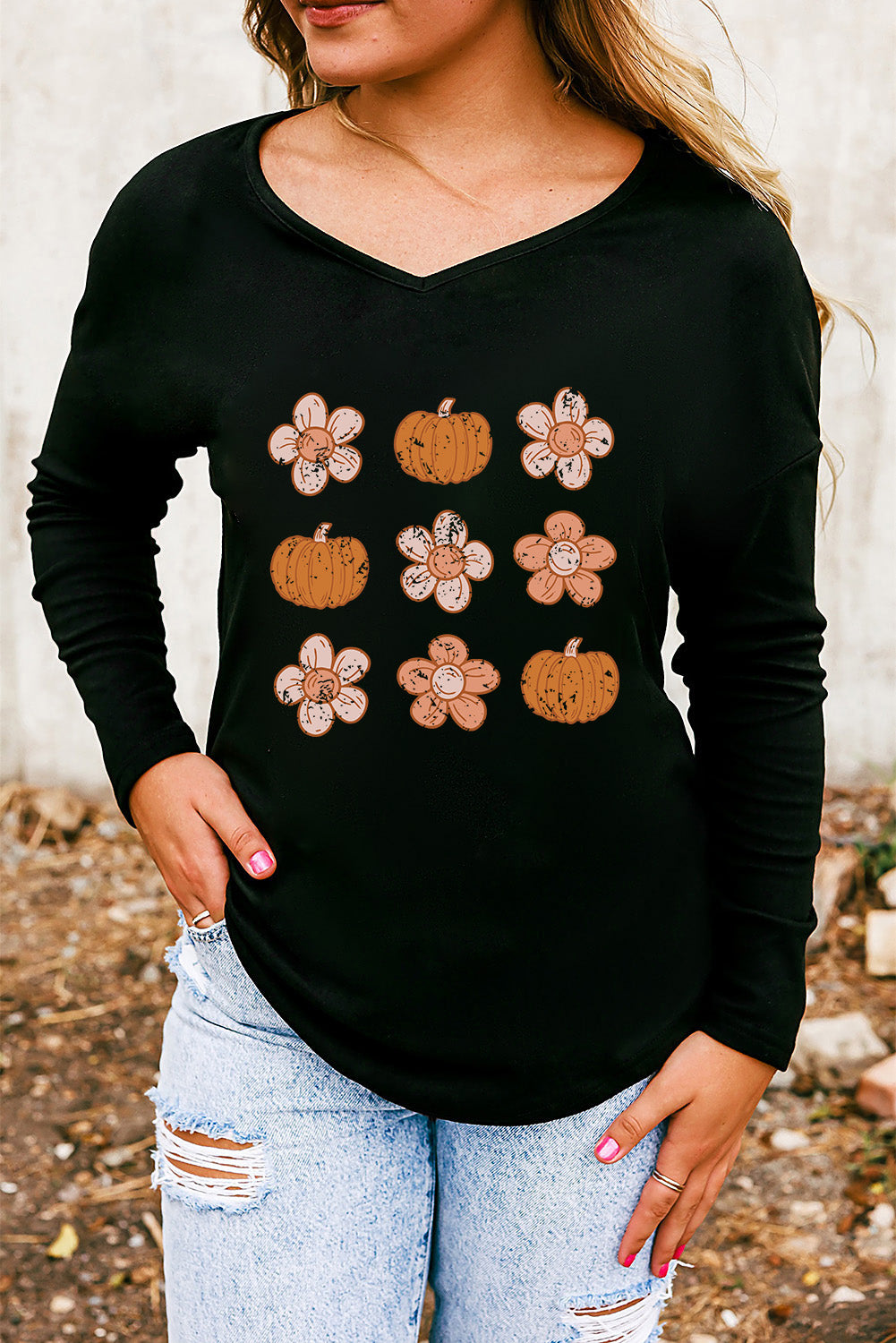 V-Neck Short Sleeve Pumpkin & Flower Graphic T-Shirt