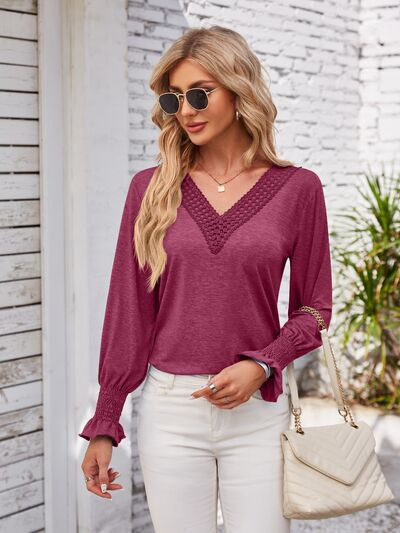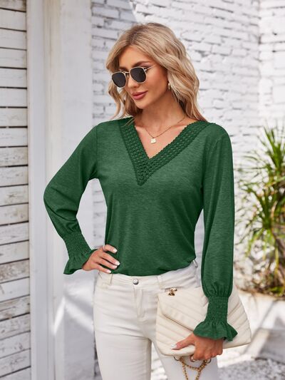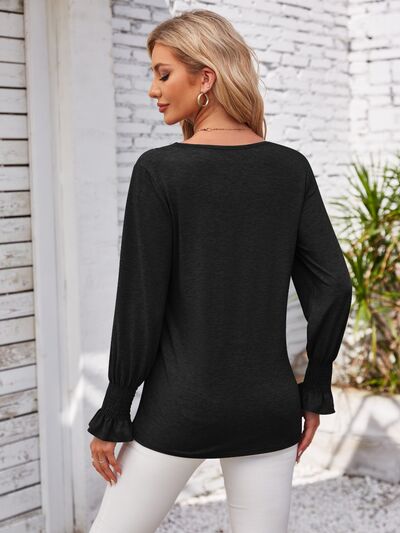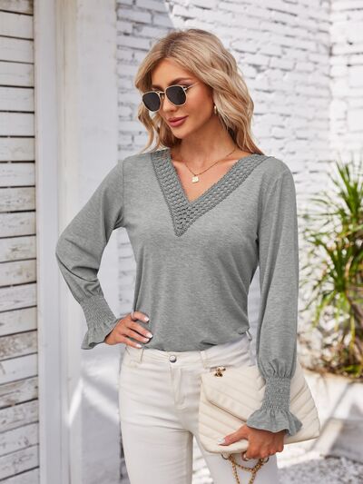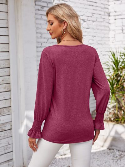 V-Neck Smocked Ruffled Long Sleeve Top
